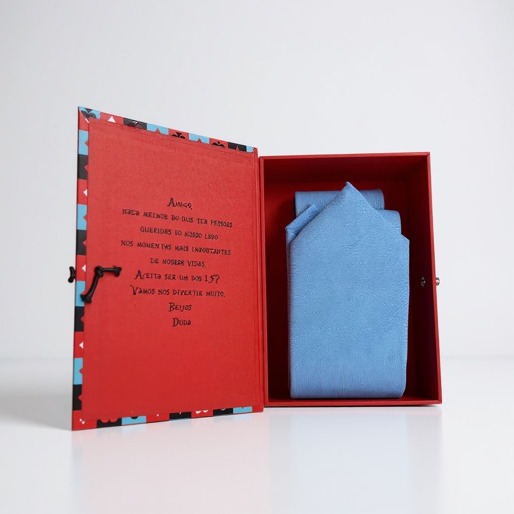 Transforme seu convite em um presente especial! A Caixa Convite Personalizada surpreende com elegância e criatividade, trazendo em seu interior uma gravata exclusiva, perfeita para marcar momentos importantes como casamentos, padrinhos, formaturas e ocasiões especiais.