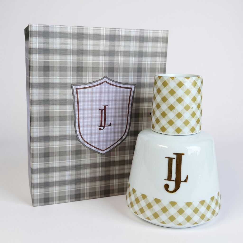 1 caixa personalizada com acabamento especial + 1 moringa de cerâmica personalizada (garrafinha + copo)