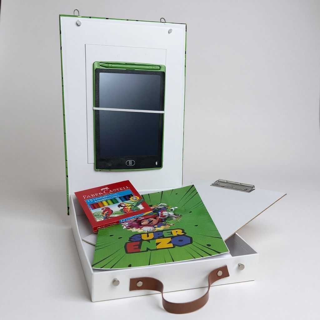1 lousa mágica + 1 prancheta rígida A4 + 1 caderno brochura A4 para pintura + 1 caixa com 12 canetinhas coloridas