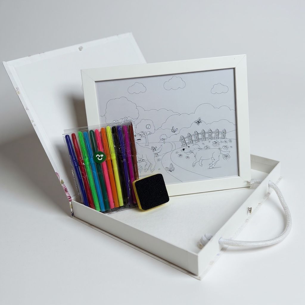 A maleta personalizada é o convite perfeito para soltar a imaginação! Personalizada, ela ela traz em seu interior um quadro com moldura e acetato, já com figura personalizada combinando com a arte da maleta — tudo pronto para ser pintado e apagado quantas vezes quiser. E para completar a experiência, o kit inclui um conjunto com 12 canetinhas coloridas, vibrantes e ideais para superfícies reutilizáveis.